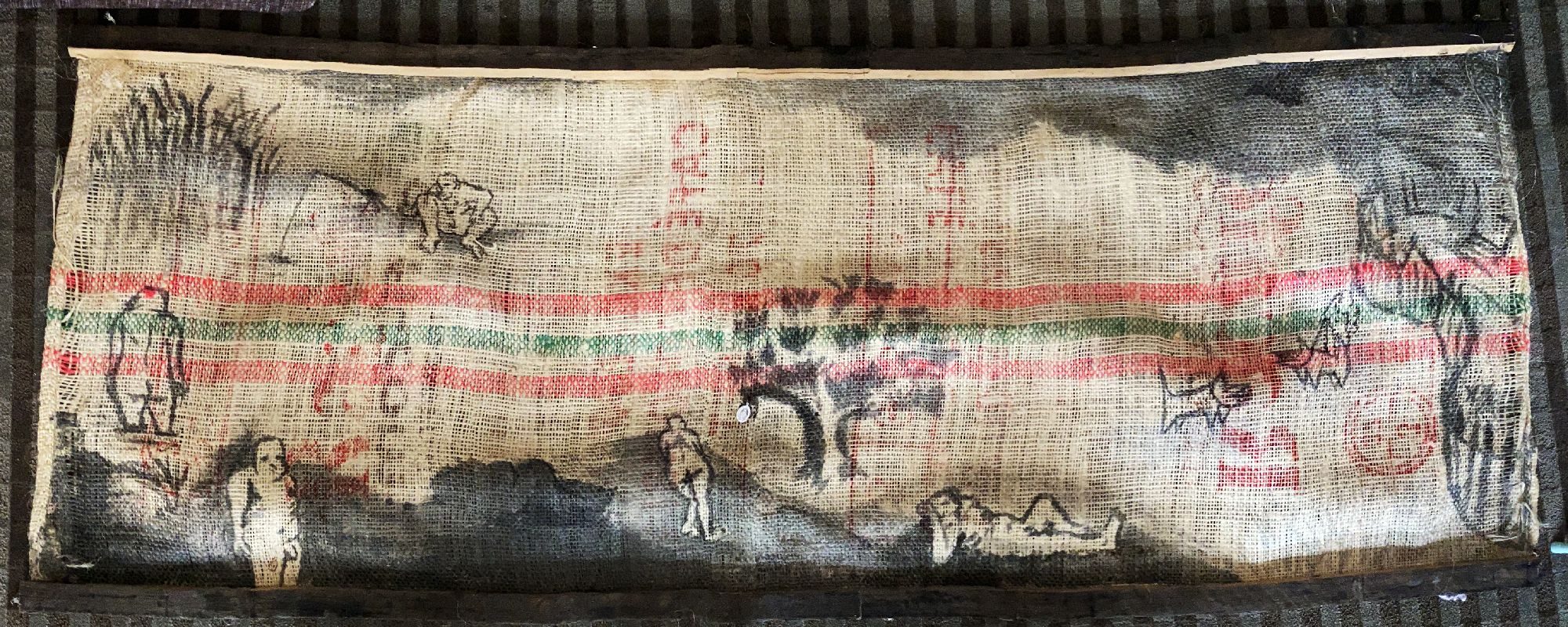 Panoramic ink drawing on hessian, with wooden frame. I enjoyed distorting the figure, and drawing people from my mind.